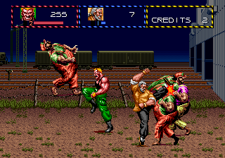 In every stage except Stages 2 and 7, if you wait around too long without fighting anyone, the boss of Stage 6- the guy from the intro who phones F.F - will run on-screen and fire a machine gun, killing every player instantly. Since he's defeated in Stage 6, he doesn't appear in Stage 7 which is just a series of boss fights with no downtime inbetween anyway. Even if you cheat with invincibility, no-one will ever appear to kill you in one hit.