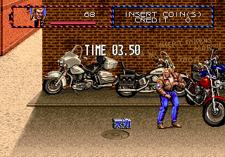 To understand D. D. Crew properly is to truly embrace crowd control. Post-Final Fight brawlers generally have some kind of 'crowd control', techniques that let you stem the tide of mooks surrounding you and give you some room to breathe. Most commonly, this is in the form of a desperation attack that attacks all around your character, getting enemies off you, at the cost of some health, but there are more subtle ways other games do it to, in particular allowing you to hit multiple enemies at once, or having weapons that offer such a long reach that you'll often hit more than one enemy with one swing. These form a basic toolkit from which you, a lone warrior, can hold a ghost of a chance against the hundreds of popcorn enemies standing between you and the end. D. D. Crew has neither a desperation attack, nor does it let you hit multiple enemies at once- even if two are lined up, only one will be hurt- and it doesn't even have traditional grabs or battering weapons (all you get are rare knives and grenades to throw). What's worse, even your basic attack isn't that effective- it changes depending on distance, and after a few hits enemies will be stunned to allow you to throw them by pressing both buttons but they very quickly snap out of it and immediately counterattack you (sometimes using a completely unique move you won't see otherwise!) if you don't realise you can throw them, you can't follow up with an automatic throw like Final Fight, and again, only one enemy at a time. That's why trying to play this like a normal brawler simply does not work, the standard brawler toolset is way, way less effective at crowd control here, and mashing the button for your combo will not help you that much. Even though only about four enemies ever appear on-screen at once and only two really attack you at once, that's more than enough to do you in.