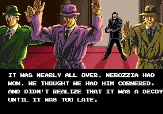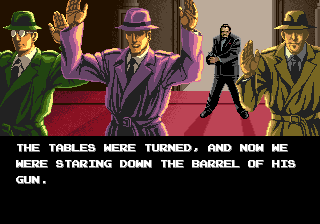 OK, so why do I like Dead Connection so much? It's a combination of things. For a start, the mechanics are spot-on. Small, enclosed arenas with no scrolling of any kind is the sort of thing Robotron: 2084 and Smash T.V. did best, and this is Dead Connection's strength as well. Admittedly, things never get quite as chaotic as in those games (the total amount of gangsters you kill in Dead Connection is probably the kill count for the first level in Smash T.V.) but, unlike Bullet which wasted its twinstick controls by being too easy and letting you run away from fights, Dead Connection keeps you pressed against the wall. There's no real escape, especially in the open arenas like Stages 6 and 7, and that's a good thing. It's slightly more manageable than Smash T.V. mostly because it's at least half as long and goes at a much slower pace. but what it lacks it enemy numbers and frantic pacing it makes up for with the diving roll (which gives you a fighting chance of escaping a gun-fight alive, as does the health meter) and the environment.