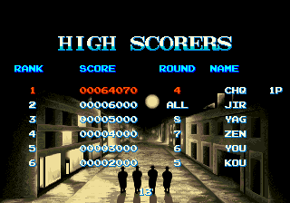 There's a handful. For a start, long-time readers (anyone?) will spot Masaki Ogata in there- Director in this game, he was also mentioned in the hidden credits for The Fairyland Story. Next, Masami Kikuchi (Character Designer) has a ton of games to his name, usually as a character/art designer, including Aqua Jack, Elevator Action Returns and the arcade Darius games up to Gaiden. Finally, the sound is provided by two members of ZUNTATA, Yagisita and Sousukun. It's a shame that Crime City doesn't have any credits, as I'd love to compare them- they're the only games I can think of where police officers can crush out the crime by diving straight into people.