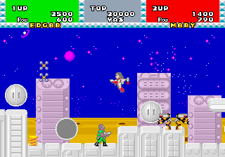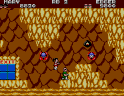It's not quite as drastic as the changes made to Laser Ghost when it hit Sega's 8-bit console, mind. The Master System/Mark III version of the game keeps the basic ideas of Quartet in place (Destroy the boss for the key! Only a key opens the door! Open the door!) but everything else has changed. For a start, the game was released as Double Target in Japan because only Mary and Edgar (misspelt Edger) are playable for two-player co-op action (I guess Sega kept its title as Quartet over here to cash in on name recognition, maybe...?) as they fight to save space colony Nine and recover the revered Cynthia's casket, stolen by aliens. Or, as the manual repeatedly spells it, ALIENS. Next, the game's structure has changed- there's now only six stages (one of which is locked unless you collect the five Star Power items from the previous stages), they're slightly bigger now, and from the second stage onwards, they're split into two rooms, which you move between using big doorways.