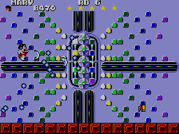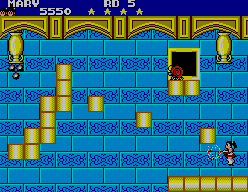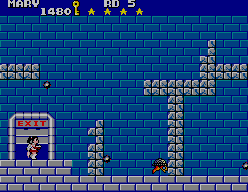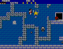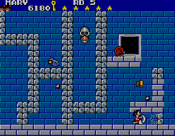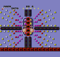 Your next order of business is the gap under the platform where Mary is in the shot on the left- shoot it to reveal a power drink. This room is much like the blue orb room from Round 3, but if you got enough points for the wave gun upgrade (and, if you've been visiting the bonus rooms, you really should by this point) it'll be pretty easy- you'll take out more blocks with a single shot because of your wider shot. Unfortunately, this room feels a lot longer than the blue orb room because of the enemies- if you thought the UFO enemies were annoying in Round 4, you now get to deal with them in very confined spaces. Good luck with that. Additionally, bouncing silver balls will keep appearing, which are an annoyance too because of the close quarters. Your best bet is to try and power your way through and destroy blocks to give yourself some room to breathe. It can get quite claustrophobic in here...
