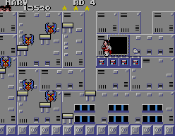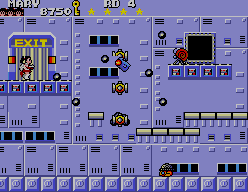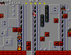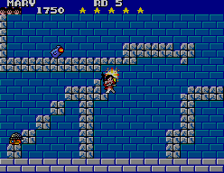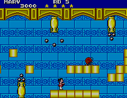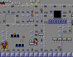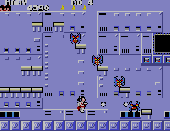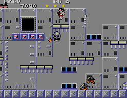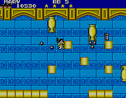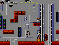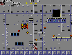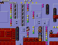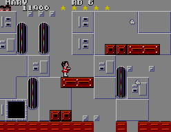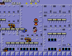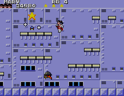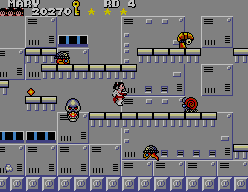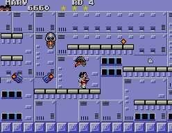 Here we are, the final battle for space colony Nine! Round 6 is a little different from the others, as rather than hunt down one boss to get a key to open the door, there's four statues you need to destroy. There's two in each room, and you need to destroy them in a specific order, otherwise your bullets won't harm them. Fortunately, the manual (seriously, read the manual for this one, it's very helpful) tells you the order you have to destroy them in (even though the game won't let you shoot the statues in the wrong order) so it's not that tricky. What will be tricky is not dying, as while there's a power drink early on in the stage (see where Mary is in the left-hand screenshot? Shoot there) you'll be pestered by fliying lips and those bloody UFOs- seriously, these guys are nearly as infuriating as the Paper Card Birds from Robocod- and if you get hit while above a pit, you can forget it. With any luck, you'll have three lives by this point, so one or two drops down the pit would be OK... But no more. Anyway, let's find those statues...