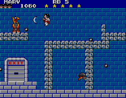 Round 4 is probably the one round in the game where you can easily get lost- unlike the others, the two rooms here basically look the same. One has a pale blue background, the other has a grey background. Try not to get lost. You'll get the Jetpack fairly early on, but this is a pretty tough stage because of the new enemies, which probably exemplify the game's problems. First, the weird hopping UFO things will get in your way, but shooting them causes them to blast off and zoom ahead, usually in your direction. Don't shoot them at close range, either avoid them or take 'em out from a distance... Which you'll struggle to do as you usually find them in cramped areas. Thanks, Sega. There's also the snail enemies (I like to imagine it's the snail from the built-in Snail Maze game, out for revenge) that, when shot, turns around- if you shoot the shell, your bullet bounces back and can hurt you! Also, you're still pestered by the lips and the skull, the latter being more annoying now as its bullets will travel across platforms when they land.