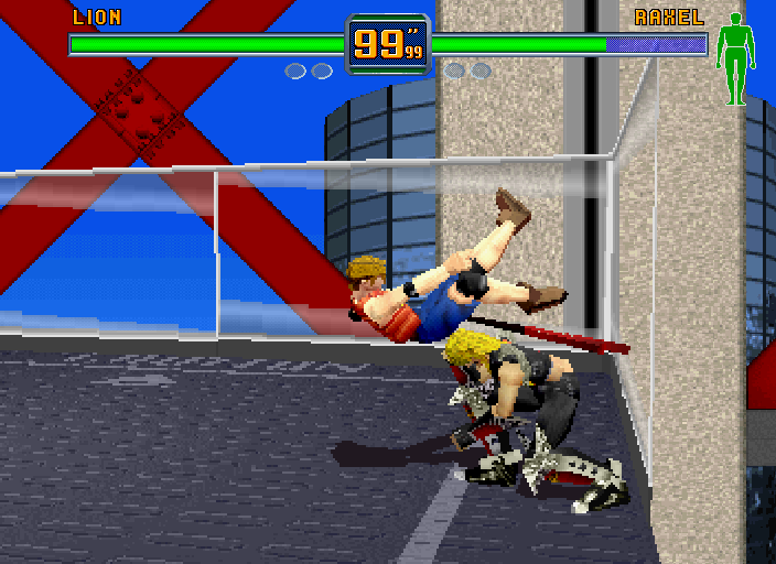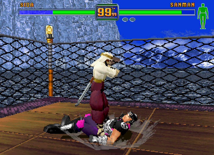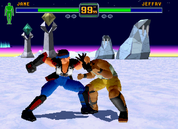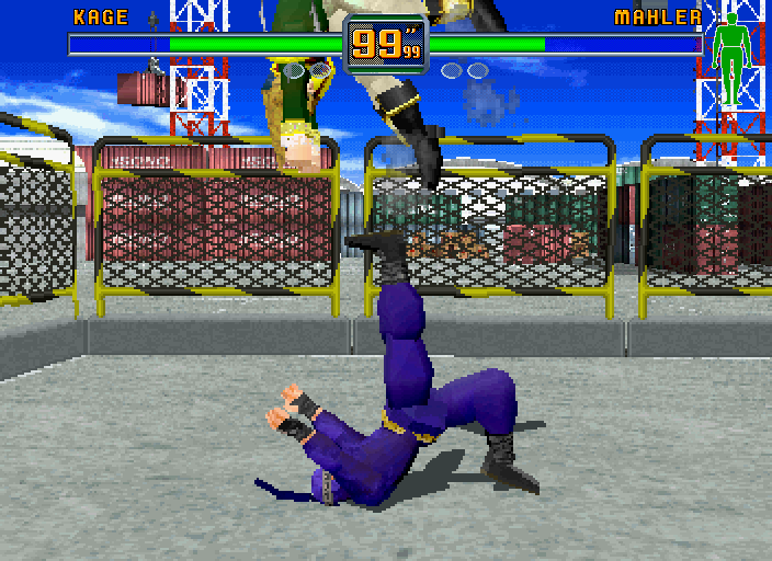 As for the game mechanics, it's unsurprising that it's in the tried-and-tested VF/FV standard. The controls are the same as ever- Punch, Kick, Guard, with a focus on strings/combinations of button and d-pad inputs rather than SFII-esque special moves- but with the addition of an Evade function (as the manual ecstatically claims, this was ripped straight from the ROM of Virtua Fighter 3) and a few moves from VF3 for the VF dudes, as well as new armour-smashing properties for some of their moves, to give them a slight boost. The FV guys also get an extra throw to account for throws from the side, and the odd extra move stolen from their VF cousins. You also get a choice between Virtua Fighter and Fighting Vipers game styles. The differences are negligible to the average player, but they're there, honest. The VF style replicates the slower pace of VF (most noticeable when jumping) and it removes a few moves and the fall damage present in FV. FV Mode is faster, adds the flip-recover (P+K+G) so your enemy can't juggle or pounce on you, and has flashier damage and camera effects. You'd think each mode would give its respective representatives a boost, but the opposite is true- VF characters have the advantage in FV mode, as while the armour keeps the FV guys snug, they'll take fall damage and the mid-air recovery means the VF characters aren't as susceptible to being attacked on the ground.