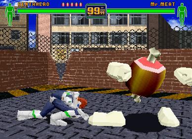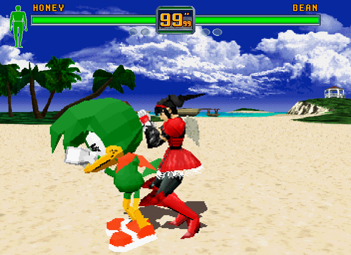 This is a fighting game where you can play as a Mexican jumping bean and a girl called Honey (or Candy) wearing a red plastic fairy costume.