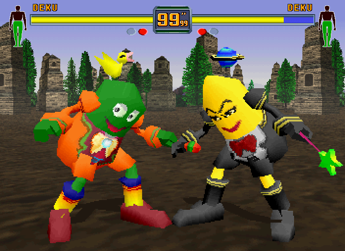 Unless you count URA Bahn, Deku is the sole 'original' character of Fighters Megamix and he's certainly, uh, something. I wish I knew what, exactly. Sure, it can be inferred he's a Mexican jumping bean (the sombrero and maraca he holds are big hints, chief, but then again, his hat hides either a bird or a Saturn logo, as you can see, so how does that factor into it?) but precisely what he is and, more importantly, why he exists is a mystery. He's also pretty much useless- his attacks are very slow and have pathetic range, and his sole trump card is a powerful kick that lands him on his back and actually injures him- I think this is the only self-harming character in the game! However, if you want to creep your opponent our, then Deku is the thing (?!) for the job. His stage isn't too exciting- it's just the training stage, but this explains why Deku will randomly replace Balls when you go to the proper Training Mode (at least, before you can change the training dummy yourself).