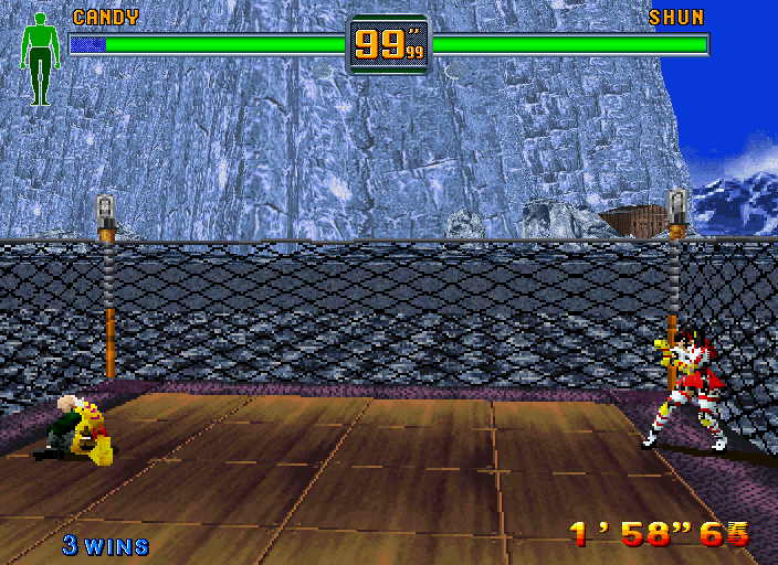 Unlike Fighting Vipers, the differences between the Japanese and Western versions are pretty negligible. Barring three of the Portrait Gallery images being changed for less risqué ones in the American release and the obvious Honey/Candy change, the only major change is to one of the songs. Originally, Rent-a-Hero's theme song had vocals in Japanese- that's why, unlike every other song in the game, it doesn't cut off at the start of every new round, so you can hear all the lyrics. This is presumably why Rent-a-Hero's Portrait pic has Japanese writing on it in the Japanese version- it's giving you the name of the song (Can You Become a Rent-a-Hero for Mankind's Sake?) and the singer (Takenobu Mitsuyoshi, of course). However, in both the US and PAL versions, it was replaced with an instrumental version. We'll let you be the judge as to whether this was a change for the better.