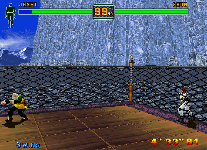 Janet isn't in this game to please Virtua Cop 2 fans, oh no- she's here for the Virtua Fighter crowd. She may be a cop from the tough streets of Virtua City, but her fighting style comes from Kyoto, as she inherits nearly all her moves from Aoi Umenokouji, a character introduced in Virtua Fighter 3. Well, there's at least one move that Aoi didn't have, and we all know what that is! Yes, Janet's pistol (back, forward, P+K) acts as a projectile, and if you do it three times in a row, you'll hear the classic "RELOAD!" soundbite from Virtua Cop (and if you keep doing it, she will indeed reload!) The problem, of course, is that against a fairly competent opponent, you'll never get it to work. Feel free to abuse it against the computer players, though! Her stage is the warehouse level from the first Virtua Cop (walled) with a remix of the music from the first mission of Virtua Cop 2.