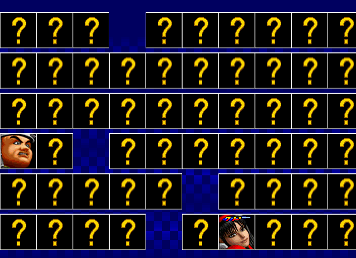 Anyway, once you've got that done and Course I is ready to select, press L and you'll be taken to the screen above. Lots of question marks! In case the name doesn't make it obvious, this is a simple matching game- pick two question marks; if they're the same character, they're taken off the board, repeat until the board is cleared. When that happens, you'll be shown the picture of Janet that appears at the end of Course D, and you play again. Beat it a second time to get the same picture but with Janet missing her body armour, and you play again. Beat it a third time and you'll get the same picture, but with Janet showing a bit more leg this time, and you'll play again... From here on, the game repeats endlessly, showing the same pictures. The only way out is to reset, and these pictures will never be added to your Portrait Gallery. Good thing Gaming Hell is on the case, eh?