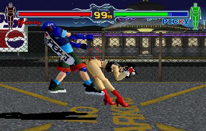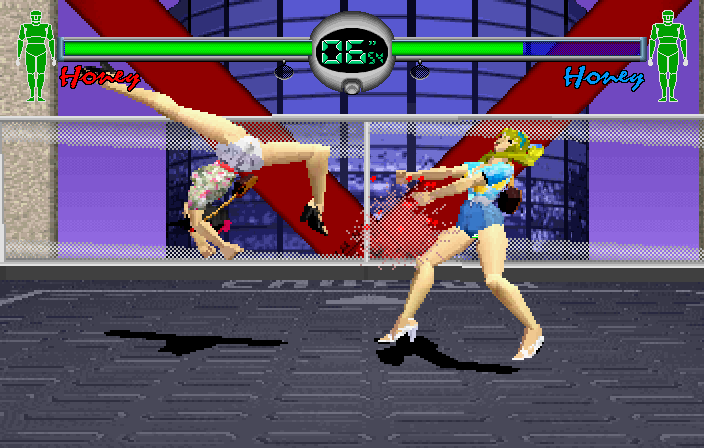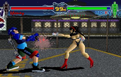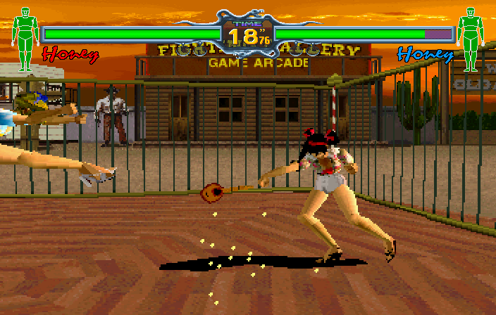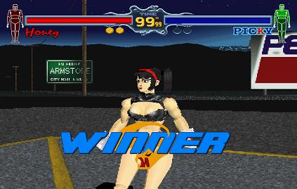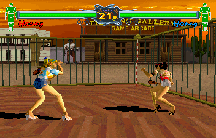 Ahaha, oh dear. The final secret that's exclusive to the Japanese version is extremely dicey, but at least it's easy to do- in the arcade version of Fighting Vipers, you have to win 100 matches in a row as Honey to see this trick in action. If the average game is 50p, it would cost you £52 to see it, at least an hour of your precious time lost, and of course, the required sacrifice of your dignity. This is the Saturn version though, so once you beat the game on Very Hard as Honey, go into any game mode and destroy her lower armour.