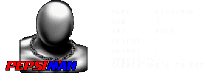 Now, one of the biggest differences between the US/UK and Japanese versions of the game is the sheer abundance of Pepsi advertising- all of this was present and correct in the Japanese arcade version of the game too. Picky's skateboard has their logo on its underside, the UFO Diner stage has a Pepsi truck and some Pepsi billboards, and some of the portrait pictures have characters with Pepsi cans... But wait, there's more! There's a walking, talking advertisement for Pepsi hidden in the game, and he's ridiculously easy to unlock. On any stage in Arcade Mode (some sites say you have to do it on Picky's stage- that's a mistake) drop your controller at the start of the match, don't press a button, and let the computer pummel you. That's it. As soon as you're about to die, the message 'CHALLENGER COMES' will appear, and the most amazing thing ever occurs. You're dumped back at the Character Select screen, with some new, stirring music... Who is this new foe that has appeared?!