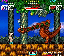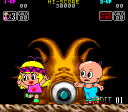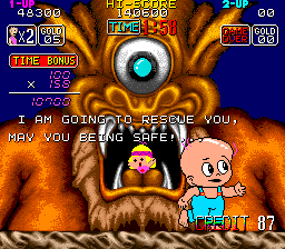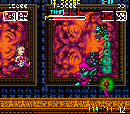 At the end of the stage, as is the platform game tradition, we get a boss fight! Are you as excited as I am? No? Good. This boss is pretty simple in theory, as he just walks around a bit and extends his head to hit you. To be honest, this is what practically all the bosses do- shuffle around a little, maybe throw smaller enemies at you, and that's it. However, as this game isn't fair in the least, given the fact that you're much slower than he is, and since if you have to continue, you have to start the boss again, you're going to die a lot to this guy. I'm ashamed to admit it, but I had to just switch the cheats on and lay into him, because my will was already starting to break at this point.