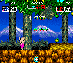 Anyway, here we are! This is 1 Stage, it's a jungle, and it's also your first taste of pain, Hard Head 2-style! Gasp! As you notice that the enemies don't actually look like anything at all! Thrill! As the slow pace of the game makes you hope for death! Become worried! As your character dies for the 15th time and you have to see that horrible ass yet again! But, you know, aside from the horrible death sequence, the unrelentingly bad music constantly repeating ad nauseum, the ugly graphics that look they were cribbed from Toki by the graphics designer in a drunken stupor, and the actual game itself that's so slow you'd swear your character was actually wading through syrup, this looks pretty normal so far.