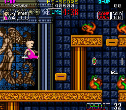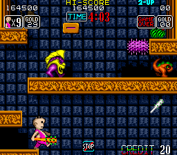 Next, it's 4 Stage, and defying all laws of logic and science, it manages to be even more generic than the levels that came before it. I mean, really, it's a typical temple location with the occasional bit of art on the wall, but mostly brick after brick after brick. There's also lots and lots of awkward and difficult platforming segments that will no doubt end with you plummeting to your death. In a further display of laziness, it's got the same enemies again, and it's even got a palette-swap of the boss from 2 Stage at the end! Can this game get any more cookie-cutter and samey?