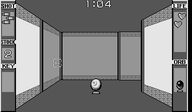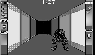 Insmouse no Yakata is a weird hybrid of a game, and oddly the closest to a first-person shooter released for the Virtual Boy. Rather than the free movement of Doom or MIDI Maze, this is closer to the flick-screen movement of a dungeon crawler like Dungeon Master, with the addition of a targeting reticle controlled with the right D-Pad. Yes, be sure to have a look at the strange beast that is the Virtual Boy's controller, because it's got dual analogue sticks D-Pads to help with 3D movement. While lacking the complexity of contemporary first-person shooters that were showing up on PCs, Insmouse is more like an arcade-style interpretation of the concept, with just the one gun (a six-shooter revolver as shown in one of the endings), basic maze layouts that simply task you with finding the exit door after you've grabbed the key to unlock it (and you can also find white and black orbs that reveal item locations on the map and show the full map respectively) while surviving attacks from the horrid monsters... And the greatest foe of all, a timer. A pretty brutal timer at that, with only a minute for the earlier stages, and up to 3 minutes later on.