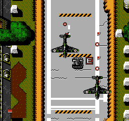 The first section here is probably the only place in the game where the enemy fighter planes will really give you bother. It's basically a runway, so it's a long vertical stretch, and bombers will constantly rain fire down on you. Your only recourse is to get the hell out of their way as unlike previous encounters, they seem to be designed to actually hit you. They also cross the screen horizontally here which they don't do very often elsewhere. Generally, the safest place to be is on the grass to either side of the runway, but you can't stay on either side long before something blocks your way. On the runway itself, there's mostly Waltar and Becks Haus tanks in the way. The enemy really do want you out of their hair, don't they? Take it slowly, being sure to take out any tanks along the way, and get used to changing direction quickly to avoid those bombs!