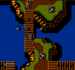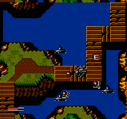 The best advice is a combination of 'take your time' and 'run, run quite fast'. You'd be best to move as fast as possible from the submarines, as the time and effort you need to take them out isn't worth it. However, you will need to stop and take out the tanks carefully, as in the confined areas you'll find yourself in here, they'll be able to rip through your energy meter like butter. You should also take out the boats, as like the F-types, they can do some serious damage. If you've got them to spare, flick on Long Range and Armour Piercing rounds- you can use Long Range to pick off tanks across the water, and Armour Piercing is handy for the multi-hit tanks clogging this area up. Also, there's a few F icons around, so you can restock... The hardest section, however, is the last stretch, which is one long boardwalk with branches to the right with goodies... And not only is each one guarded by several tanks, but you get submarines and boats doing drive-bys on you. You need to take this section slowly, to a point- take out every tank and boat, and try to scroll submarines off-screen before grabbing any icons. You'll know you've reached the next checkpoint when you go across one boardwalk surrounded by six (!!) submarines. Run the gauntlet and reach dry land, you're outta there!