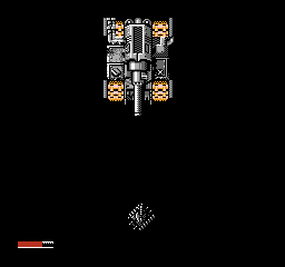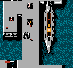 Once you're in the door, there's a boat-themed pre-boss area for you to get through. It's pretty tough, actually- it's mostly a straight path, but you're attacked from both sides by massive ships loaded with turrets. They fire a mixture of gunfire and cannons, and you're attacked by tanks too. You won't be able to just run through and avoid their fire, sadly, but what you can do is abuse the ? icons that appear on this path- you should have some in stock already, so use one to clear the screen, then grab the ones that appear here. You should be able to keep at least one use of it left by the time you reach the end of this area. Not much to report beyond that- just be sure to make a detour for the R icon to get all your energy back.