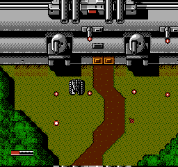 The next section is what I call the Heart Base, simply because some parts of it have giant heart shapes made out in tiles on the floor. Aww. This is a long section which consists of biege walled areas split up by small forest paths, and every kind of enemy tank- the one-hit Louis and Gustafu and two-hit Waltar and Becks Haus machines- will attack you en-masse, as well as infantry who guard entrance-ways to the walled-in sections (can't get past the doors? Blow 'em up, of course!). The main problems you'll encounter in this area are the confined spaces (very few opportunities to take cover) and the limited supplies. Aside from a V icon at the very beginning and some F icons near the end, there's barely any items here... And with all those multi-hit tanks you have to plough through, this makes it pretty tough. There's only two checkpoints throughout, too, so you'll have your work cut out here. Your best bet is to just avoid taking damage as much as possible- use what little cover is here, and when tanks appear in packs of three, only destroy one. If you destroy all three, another pack will spawn quickly, but just bust one and move along and you won't be bothered again.
