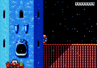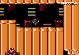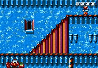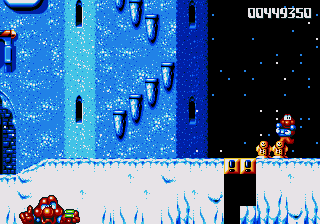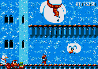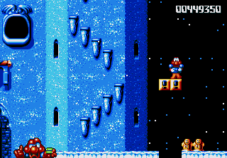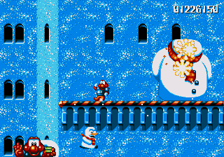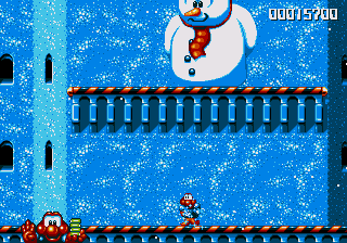 Dr. Maybe's final line of defence against Pond is a gigantic snowman thing that he's controlling from the inside, and he's not playing fair. The only boss aside from Chinchin and Cheechee to put up a real fight, the Maybe Snowman Robot seems impossible to kill at first- it's difficult to get onto the platform it's walking along, you're constantly pestered by smaller snowmen, and even if you do manage to get near it, you won't be able to hurt it. Instead, you'll have to bide your time until his head pops off and starts bouncin' around- jump on it and attack the body while the head's gone. If you're really awesome, then you can bounce off the head, tuck into your Expandosuit, nail the body, and hit the ground on the other side of the screen. However, every time you hit the robot, it'll spew out more small snowmen for you to deal with, so kill them, and repeat as necessary.