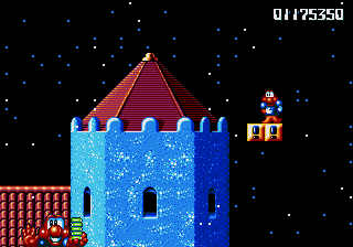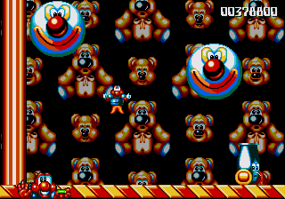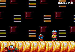 Both stages have floors constructed entirely of orange jelly, and if you jump on it, you'll bounce around as if the entire stage consists of trampolines. The more you bounce around, the higher and faster you'll get around, to the point where if you tuck into your Expandosuit and hold down the jump button, you'll zip across the stage like a near-indestructible pinball, wreaking havoc on any enemies dumb enough to get in your way. Needless to say, this is very, very entertaining, and it's so disappointing that you don't get to fool around with it for very long! The second of these jelly stages makes things even more ridiculous by turning things upside-down for absolutely no reason, which serves to make matters even dafter.