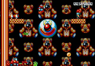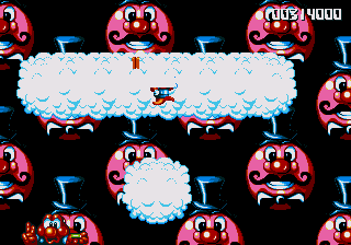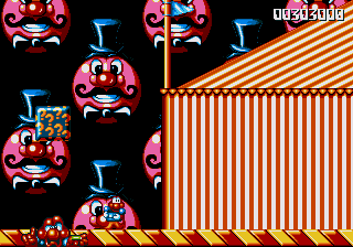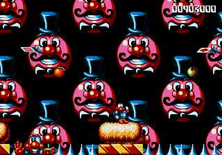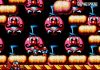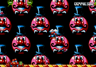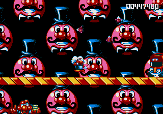 Now, the odd thing about the Circus World (aside from the fact that the scary face from the Fluffy Toy World is back) is the fact that, well, it's piss-easy. You'd think, being the final world in the game and all that, it'd put up a fight, and playing through the stage normally seems to confirm this suspicion- lots of Icarus Kids and peanut-spitting elephants trying to kill you. However, at the start of this stage, you can hop onto the roof of the first circus tent, then make your way into the clouds- there's a Wing item stashed away in one of the bigger clouds, and it robs the stage of any challenge it may have once had. Just fly all the way to the right, then fight your way through some Icarus Kids to get to the Exit Pole, and the job's done.