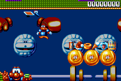However, in 2004, over 10 years later, Robocod made a dramatic return to the video game scene, with a pseudo-remake released for the Playstation, and a year later, ports to the Game Boy Advance, Nintendo DS and PS2- the screenshots here are from the GBA version. Why Robocod, of all games, was chosen to be brought back from the dead is something that still confuses me to this day, but hey, introducing it to a new audience is OK with me... Although perhaps not quite like this. Why would I say that? Surely I'd support such a re-release? Maybe it's because, aside from (possibly) the DS version, all these 'ports' are absolutely horrible.