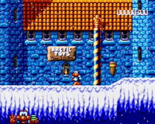 Admittedly, there are a few complaints- while most of the stages are short and sweet, some drag on for a bit (Car Maze, stand up at the back) and while some of the cheap shots (courtesy of the Paper Card Birds) do feel a bit unnecessary, this is negated by the health items that are rather liberally scattered about, and the fact that you can even take more than one hit in the first place is a plus. Honestly, though, aside from the Sweet and Car worlds, Robocod is one of those games that isn't absolutely amazing- it's the very definition of a 3-star game- but it's just fun to pick up for half an hour or so and blast through for laughs- most of the levels are pretty short, so it doesn't take that long to make a fair bit of progress. If it had a legit password feature to let you play any level, it'd be even better, but that's really a minor quibble.
