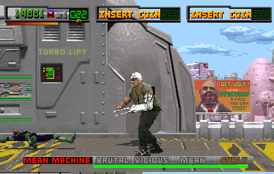The Test Menu (if you're following at home on MAME, press F2 at any point in the game) is a very handy thing for arcade operators, but most of the time it's a bit useless for players- often, it's all about the pricing of the game, and in American games especially, there's a bazillion different pricing options, designed to rake out as many quarters out of people as possible. Judge Dredd is no different, but you can also set the starting level (referred to as 'wave', like in a lot of Midway titles) and it goes all the way up to 27! Unfortunately, if you're expecting a load of missing levels from here, you'll be disappointed, there's only one. Since the numbers don't logically match up, here's where each one takes you.