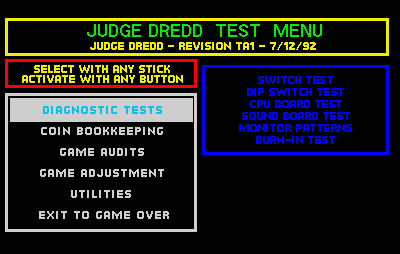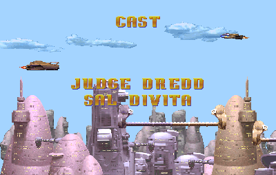 The credits are pretty interesting. Dredd himself is played by Sal Divita, who was also Cyrax/Sektor/Smoke in Mortal Kombat 3, and the other characters are all played by Midway programmers rather than, for want of a less patronising expression, 'professional' actors. As well as Jake Simpson (Software and Design) and Eric Kinkead (Art and Design) whose comments you've seen throughout this article, you'll also spot Tim Coman (Playing Pa Angel and in Art and Design), which is where the name of one of the Block War blocks come from. There's also Curt Chiaerlli, who did the stop-motion work- as well as Goro and presumably Judge Death, he also did the prosethic make-up for Sal Divita to help him become Dredd. Finally, Ed Boon gets into the 'Special Thanxx' section, who's a bit more famous for his work on a funny old game called Mortal Kombat- he was used as a sounding board during development.