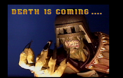 Also, in case you're wondering why Death looks so crazy-awesome here, it's because he was a mannequin, much like Leglock and Goro from Mortal Kombat. Eric Kinkead was particularly impressed with it- Oh man, that Judge Death model was so awesome. At least, if not as cool as Goro. I would go into either Tim or John's office and look at that thing constantly. Although that close up picture of him... Doesn't do the model justice.'