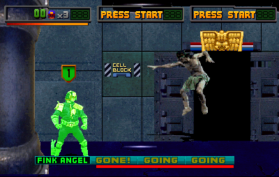Once you beat Leglock again, you'll find yourself stuck, as the level isn't finished. The game won't advance any further, so you'll have to reset (and, preferably, go back to the Test Menu and pick a different starting wave) to get out of it. Oddly enough, Simpson himself doesn't even remember adding this level, but it would've been easy for anyone on the team to add this stage in becayse of the way that bosses were programmed- 'all the AI was actually in the animation scripts for each of the characters. It would run through a set of animations and at key points, call functions to determine what to do next- so with fink he'd frame to frame doing his idle script, then on the last frame, he'd run a function that would determine if he'd move towards you, move away from you or just keep doing his idle... This results in a bad guy you can drop in anywhere, in any level, with any other badguy and it all still works'.