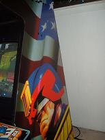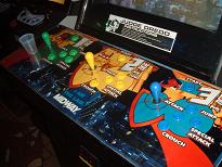 The control panel did indeed come from NARC. I hated it, but everyone else said it had worked out well with NARC. This was my first game, so I just let it go. [Regarding the cabinet art] We pioneered the multi-color cabinet printing too - till then all cabinets where 4 color process - we started the mixing of colors. The cabinet was the standard Midway universal cabinet - about the only thing unique about it was the red piping down the side.