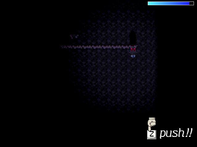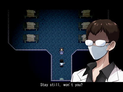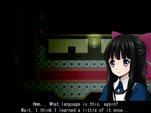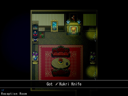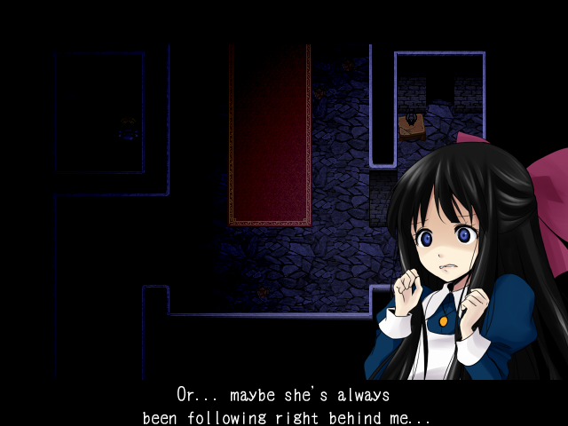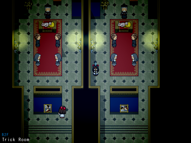 As for its visuals, most of the game's assets are from free resource packs (some that freeware horror veterans will recognise- one girl's sprite is the same used for Viola in The Witch's House, and a music track shows up in the storybook video in Ib) but it uses those assets remarkably well to create both the luxurious mansion and the labyrinthine laboratory. A big element of this is the lighting- most places in the game are dark, so while Aya can usually see most of the screen, the peripheries tend to be shrouded in darkness. It's never quite to the extremes The Witch's House goes to where seeing anything is a strain on the eyes, but it helps add atmosphere and a sense that you're mostly alone in this creepy place. It also does the common trick of having things happen by themselves, such as tables falling over or bloodmarks appearing on walls, but its usage here is neat- most of the time, the game will not stop to point it out, as it does in other games. As a result, you'll find yourself constantly second-guessing and double-checking things- did that doll just get up? Is there really a hanging corpse in that room across the way? It's a common trick, but it's done very well here, giving you the feeling that you need to have eyes in the back of your head at all times if you want to see every detail.