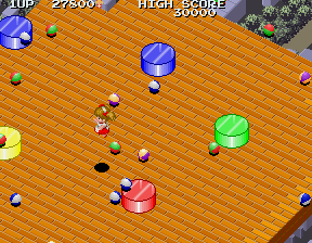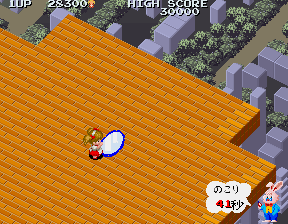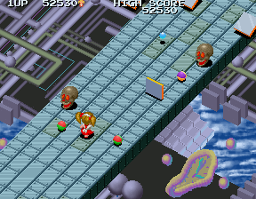 Ah, now this boss is a little bit different. The fight starts out with five giant disks flying around and firing loads of bullets at you. After a while spinning around, they'll form together, launch out a circle spread of bullets, and, well, that giant red thing shows up. Hey, haven't we seen that before? It's a Dharma doll, which also appeared on John Smith's shirt in The Outfoxies, but that's not the point here. It seems that Namco's forgotten that this is supposed to be Alice in Wonderland, not Alice in Doki Doki Japan World! Where the hell is the Cheshire Cat? The Caterpillar?! The Mad Hatter?! The literature geek within me is fuming right now. Fuming. Back to the task at hand, the Dharma doll doesn't really do much at this point in the battle, but while he's standing on top of the disks, they become easy targets.