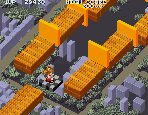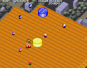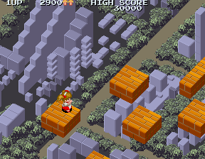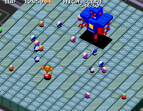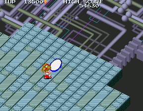 Well, close enough- the ground's metal enough. The major enemy that debuts on Round 4 is the Skull Turret- these things just sit still and bombard you with bullets. They also take about 5 shots to kill, so they don't go down without a fight. Lucky for you, there's hundreds of these assholes peppered about this round. Have fun with that, and have even more fun with the platform action shown in the screenshot on the right- this jump appears several times in this level, and it's just as hard to get right each time. Sodding isometric perspective.