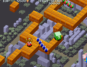 After the initial orange walls segment, we've got more precarious platform perils (mercifully without the orange menace) before we finally hit some solid land... To be assaulted by these weird tower things which launch up to five disks at you, 'til they're nothing but a harmless and destructible head. Fortunately, their shots are really easy to avoid. There's also some completely harmless giant dice (which I didn't get on this round, but it's on the intro page if you're that desperate) which don't seem to attack you at all. However, the enemies here are really easy to handle, so this section goes by pretty quickly.
