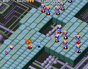 As we get further on, while the attacks from the giant rectangles (clearly stolen from Xevious, no less) get more intense, you can easily see that the insane platform negotiation from the last round, aside from the cruel jump at the beginning, is mostly absent here- these big platforms move around a bit, but they're not as bad as anything we saw in Round 3. Additionally, we see the return of Tweedledum and Tweedledee, as well as some new Robot enemies. I'd point out that there were no robots in the original books, but you know what? I've given up hope of seeing anything from the books in this game at this point, so let's soldier on.
