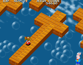 Or so you think. Alongside the unintentional religious imagery, Round 5 seems to take place... Well, considering all those clouds, I want to say it's in the sky, but there's loads of bubbles, too, and the enemies seem to be those you'd find under the sea. I consider this very confusing. What's as plain as day is the fact that this is a pretty brutal area. The awkward layout of the platforms notwithstanding, we have the second most irritating enemy in the game; the Flat Fish. It doesn't believe in these 'platforms' it's heard so much about, and so floats across the screen in an erratic manner. When it touches you (and it will) then it'll drag you off the platform to your death. You can shoot it to shake it off if it grabs you, but in all likeliness, you'll be near a platform edge anyway, so kiss your life goodbye. The fact that this early section comprises almost entirely of small moving crosses doesn't help.