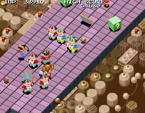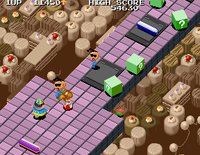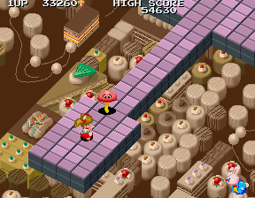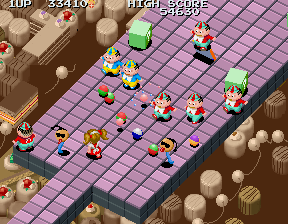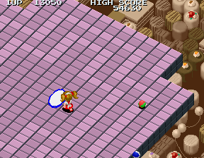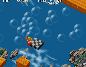 Despite impressions to the contrary, within five seconds the round kicks it up a notch, and decides to show you who's the boss. Tweedledum and Tweedledee clones march from the top of the screen in relentless droves, firing bullets with wanton abandon, but worse than this is the most annoying enemy in the game... An enemy I can only refer to as The Shades Snake. It's that little blue snake-like thing with the huge head, and you will learn to despise this enemy before this level is over. The majority of the ? blocks in this round are filled not with goodies, but with these guys, and their sole attack is to home in on Alice and push her off the platform. This wouldn't be so bad if they didn't do so with such blazing efficiency, and if your shots did more damage to them. As it stands, they're tough cookies, and the only way you even stand a chance is to keep as far back as possible, destroy the ? blocks so they're released, and pick them off with charged shots from afar.
