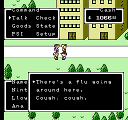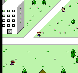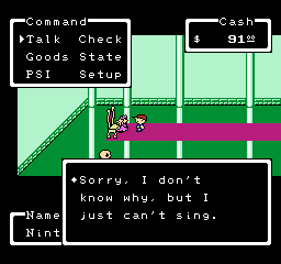 However, the setting and vibe of Mother is what sets it apart from other RPG series and this is something established here, even if it took the second game to really iterate on it. The contemporary setting goes against the common set-dressing of JRPGs at the time, of medieval fantasy or science fiction (not that there weren't any on Famicom- look to LaSalle Ishii no Childs Quest for something set in modern-day Japan), and while it does lean towards fantasy and sci-fi at points, especially near the end, it mostly sticks to its theme. I think it's important to note how it commits to this setting in ways outside the locations too, it's across the whole game. Your weapons are baseball bats, frying pans and slingshots, your healing items are fast food and juice boxes and you even get a bunch of joke items like a ruler to size up the enemy and 'swear words' to cuss 'em out. The NPCs, while concerned with some of the strange happenings in the world, also complain about a strip joint setting up in their town and recommend the local tourist spots (and honestly, are worth talking to, there's some real funny lines in there). The enemies in your way range from the fantastical like sets of eyes, men from the stars and living gargoyles to the mundane like stray dogs, scorpions and disgruntled farm workers, and many of them aren't defeated or terminated at the end of a battle, they 'come back to their senses' or 'become tame'. Sure, it's mostly window-dressing but it's extremely effective at giving the game an identity, even in small details like flavour text which, honestly, was localised really well given its release era (I'm a big fan of Mr. Bat 'thinking about the circumstances' especially).