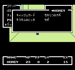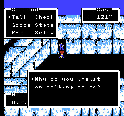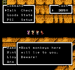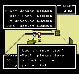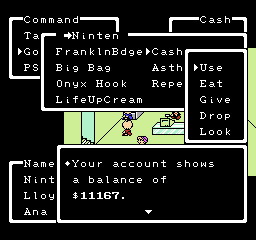 Another part that's interesting is how equipment and items work, including how you hang on to them and where you get your gear. The limitation of eight item slots per character sounds like a big problem at first, given that there's four equipment slots to consider but, surprisingly, the game has a solution to this- when you equip an item, it removes it from your inventory. The exception is Lloyd's machines which he doesn't equip and has to keep in his inventory. This has its disadvantages- once you equip something you can't remove it unless you have something else to replace it with, a bit like kusoge classic Hoshi wo Miru Hito although equipping stuff isn't detrimental to your success here- but it helps with decluttering your inventory for the important things like a cash card and as many burgers as you can carry. Ninten on his own might struggle a little at first, but he does have LifeUp to help him with healing to mitigate reliance on items and once you find Lloyd, space becomes less of an issue, plus if you return home or to Magicant there's a character who'll hang on to useless junk for you, so you have options until you get a full squad. There's some menuing involved in swapping items between characters, especially if one's knocked-out, but conveniently each character's items fits on a screen each rather than scrolling, so it's not too bad. Honestly, by the end you'll probably find that you have a lot of spare inventory slots- Lloyd is the one who'll be using battle-exclusive items, and you might not need too many otherwise- so be sure to fill them up with the infinitely-available LifeUpCream supply found at the foot of Mt. Itoi, you'll need 'em!