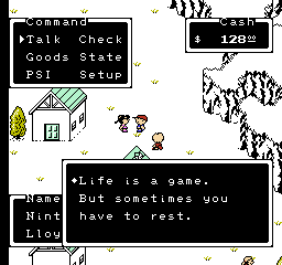 The soundtrack, co-written between Keiichi Suzuki and Hirokazu "Hip" Tanaka is another high point of the game with some very mood-setting pieces. These range from the contrast between the slightly lonely-sounding Pollyanna (I Believe in You) when you're exploring the field on your own and the bouncy, upbeat Bein' Friends when you've got your friends by your side, to the folksy and inviting Humoresque of a Little Dog for when you're shopping, to the genuinely-menacing Battle with a Dangerous Foe that went on to be used as the Your Sanctuary boss theme for the SNES game. In fact, a lot of these songs would reappear, way more than you'd expect, and while we were denied a SNES rendition of Bein' Friends, many of these songs are definitely good enough to warrant being updated to the SNES sound style. Finishing up the presentation side of thing, while 'charm' and 'character' are nebulous, intangible things and vary from person to person, I personally think they're qualities that can be attributed to this game and the series as a whole and give it a lot of appeal. I suppose a little bit of that is nostalgia too- I wasn't around for the initial release of course, but after playing the first Super Smash Bros. I learned all about the series from the internet and actually started with this one, as the prototype had been already found by that point- but while I don't like to indulge in too much nostalgia, maybe it's appropriate for a game like this, seeing as the original title is Mother and all, invoking feelings of home and family.
