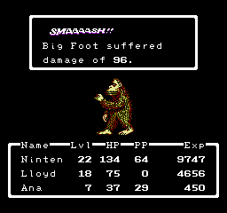 Presentation-wise, the game mostly falters in the reuse of tilesets as already mentioned and the overworlds and interiors in particular aren't as detailed as something like Final Fantasy, but there's a bit more variety in them as you get later in the game and areas like Magicant and Spookane have their own little details that make them stand out (I'm a big fan of Spookane being so dilapidated, taking the familiar town tileset and distorting it just enough). The enemy art is a real highlight, as while there's no backgrounds to the fight scenes (instead taking place over the inky darkness like Dragon Quest II) the designs are full of character, with even normally-mundane things like a fly or a possessed lamp having some kind of personality shrine through their static sprite art (and some of them were made into clay models for promotional art, really worth checking out). That said, some have a slight realistic edge to them when compared to their SNES equivalents- the Stray Dog has a mouth of sharp, sharp teeth compared to the SNES game's more docile-looking, almost playful Runaway Dog, and the Bear looks like it's way less friendly and more likely to eat you- but that helps make the designs feel distinct from their later counterparts, and they have an appeal of their own too. Most of the rest of the graphics are functional and get the job done outside of those dungeon tilesets, but you can tell a lot of heart went into those enemy designs.