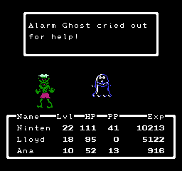 Cripes, there's a lot of moving parts to consider with an RPG, huh? That moves us on to how battles work. Early on when your options are limited, it's pretty basic, very much in the Dragon Quest style where you see your enemies and just bash their noggins in to proceed. It doesn't get massively more complicated as you gain party members and abilities but there are some pretty interesting parts to it. Let's start with the party members you get, there's a grand total of four but you can only have three at a time. Ninten in particular is an ideal starting character- as well as being strong, he quickly learns some very helpful healing and buff / debuff PSI abilities (the game's equivalent of magic) to keep him alive when he's on his lonesome, especially 4th-D Slip which guarantees an escape for non-boss encounters at a high PP cost and Defense-Up. This also helps when new characters join the party as these skills can help keep them alive as they get up to speed. Speaking of friends, Lloyd is the nerd with his lack of PSI being replaced by powerful weapons like Plasma Beams and Flame Throwers that serve the same functions as some higher-level PSI abilities but having a chance of breaking after use so, with the right equipment, he can definitely dole out plenty of damage. Ana is the frailest member of the team and you can't rely on her for physical damage but she makes up for it by learning several advanced PSI abilities well before Ninten does (she learns LifeUp π at 22 while Ninten has to wait until 35!) plus all of the offensive PSI skills like PK Fire that attacks a row of enemies and PK Freeze which can put adversaries in a critical state, cementing her as your number two damage-dealer, as well as being able to shut down certain enemies entirely with PSI-Block. Finally, there's Teddy who temporarily kicks Lloyd out (don't worry, he'll be back, complete with Teddy remarking "Brute strength is not enough to defeat them", a message you should take to heart) and replaces his smarts with pure brawn, able to deal huge amounts of physical damage especially if you equip him with a Sword or Katana. The fairly nice spread of specialities and attributes give your party members individual uses and personalities, and while there's nothing like more specialised abilities per character, each character feels unique enough to contribute to battle in their own ways. Just a shame you can't keep Pippi the whole game, she can take on an army of zombies all by herself!