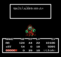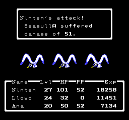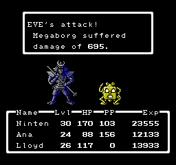 There's further changes too, as documented by skye07 on GameFAQs- there was originally a line referencing Dragon Quest by name, changed to Super Mario Bros. in the localisation prototype, that no longer references a specific game, EVE leaves a Memory Chip behind that lets you warp back to Mt. Itoi which is preferable to limping your way back up if you decide to leave, you now have a Check / Talk shortcut with L, the graphical effect for entering battle is now a mosaic... The big one is that the tile-based movement is gone, replaced with movement that more closely resembles the SNES game, which sounds nice on paper but overlooks a key detail- enemy encounters are still rolled on every step, which means in this version you might move a single pixel after a battle and immediately get into another one. Oh dear. Most of the graphics beyond menus being scrunched up haven't been changed from their internal NES resolution, meaning that you don't get to see nearly as much of the map so it's significantly easier to get lost, and with the music and sound effects being much lower-quality, this all combines to mean that while there's some nice additions here and this is the only way for Japanese audiences to play with many of the improvements made in the localised version, it's not an ideal version of the game.