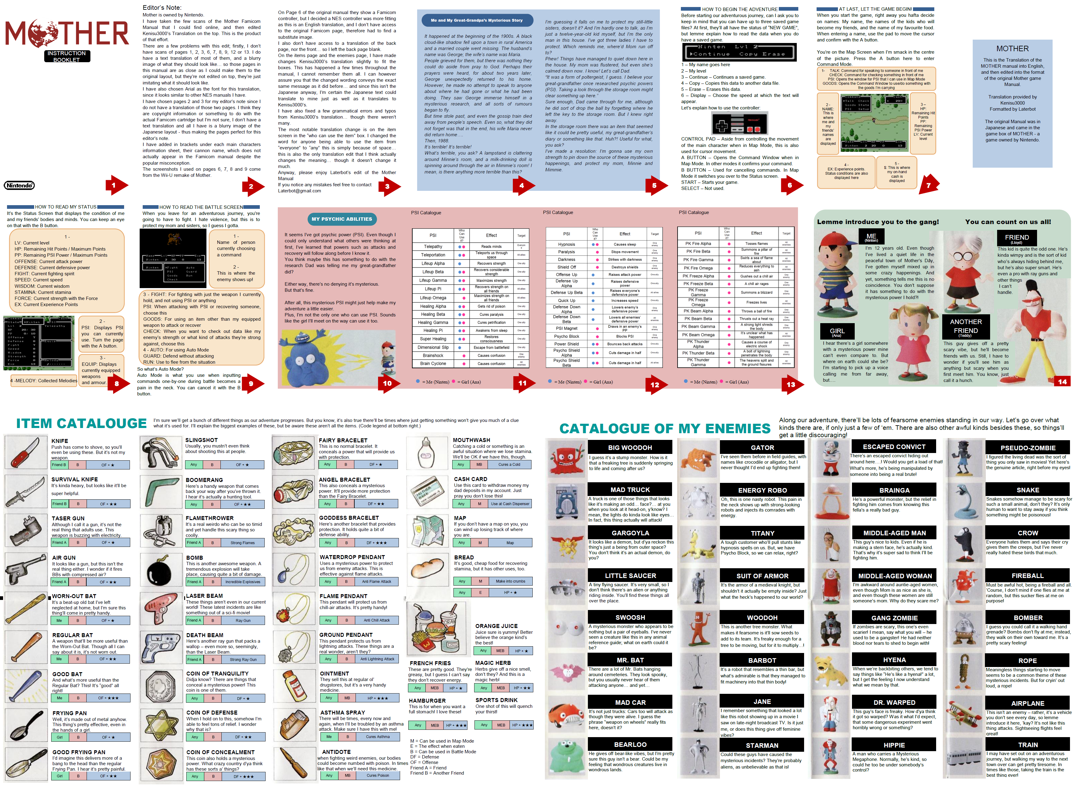 That's only the first half of the story though. The second half is even wilder- the English localisation of the game. Scheduled for a 1991 release in America and promoted in Nintendo Power with this blurb in Issue 18 (oh hey, there's another cancelled NES game on this page!), Mother was going to come to the US under the name Earth Bound but 1991 came and went without a release and the game disappeared, with the name (now EarthBound, all one word, capitalised B) being repurposed later for a localisation of Mother 2 on the SNES in 1994. We're very fortunate that Phil Sandhop, Localisation Producer and English Script Writer for this cancelled Western release, was interviewed about it and offered a lot of insight into how it was localised and their plans for the release. As was typical of JRPG releases in the US around this time especially from Nintendo themselves (remember, they published Dragon Quest / Warrior and Final Fantasy in the US) the plan was to bombard the player with information so there was no way they could get lost (see also: Sword of Vermilion and Phantasy Star II on the Mega Drive coming with player guides) via an 80-page manual / player's guide themed after the in-universe Great Grandfather's Diary that would take the player about halfway through the game (with it ending on what looks like a ripped-out page) plus a world map and enemy listing as part of a poster. Phew, that's a lotta info to give the player! To be fair, the original Japanese manual as translated by Reddit user Laterbot included quite a lot of info too, especially all the PSI abilities you could learn, but this proposed manual sounds like it was even more exhaustive. In the vein of the Dragon Warrior localisation, there were some big changes made to the game too and not just standard policy-adhering content changes like cigarettes and blood being removed. This included things like adding a run function (originally a debug function, Sandhop lobbied for its inclusion as a feature), an always-accessible map without the need for an item and even an extended ending! We'll cover some of those changes in more detail later, but the point is this was no bare-bones effort.