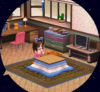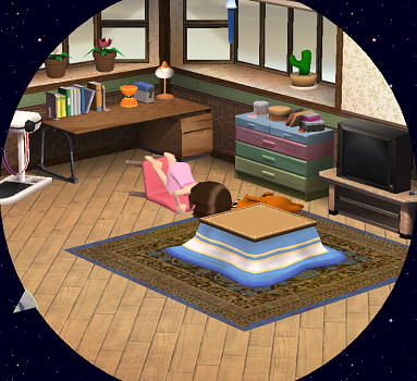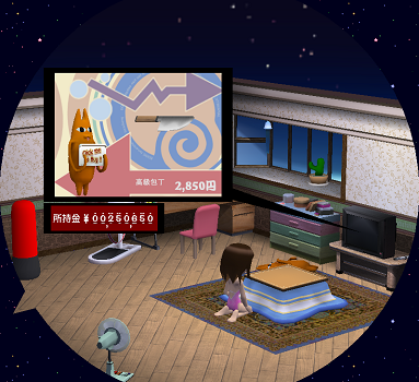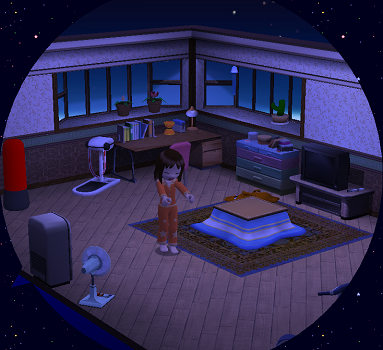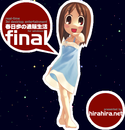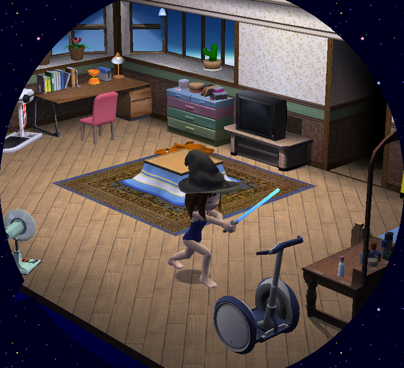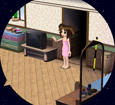 Anyway, what interests us today is Osaka Simulator FINAL, a desktop application (if that's the appropriate term) that stars Osaka. Produced by hirahira.net and released in 2003, it's almost like The Sims if The Sims had absolutely no gameplay mechanics. That's why we're calling it an application instead. Osaka resides in a room that's pretty empty when you first start, and has only basic clothes, but she starts with a certain amount of money and earns pocket money after every day (yes, there is a full day/night cycle, but Osaka doesn't sleep for long). During the day she... Well, she does Osaka-like things, like swinging back and forth on her chair, stretching and generally being lazy. As a passive observer, you can't interact in any way aside from zoom in and move the camera around. At certain points, however, she'll watch TV and get the chance to buy a new thing for her room or for her to play with, such as an exercise machine, a witch hat or even a butcher knife (so you can sorta-recreate the moment from the show where she wanders around half-asleep with the knife). Buy the thing and it gets added to the room.