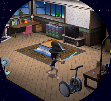 And, er, that's it really. Everything you get gives Osaka different actions she'll randomly perform (she really loved the teleportation item while I was playing, though) so there's plenty to see Osaka do. If that's your thing. It takes quite a while to get everything, considerng there's also some food items that are offered repeatedly for sale as they're finite, but the menu (available from a right-click) lets you know what percentage of items you've got. Once you've bought everything, Osaka's TV explodes and you get the credits, after which she'll fix the TV and carry on... Being Osaka. Downloading the update from the official page adds a function after you unlock everything, where pressing Z and X will cycle through all the clothes and accessories for Osaka (in a seemingly random order). That's your lot, and that sounds really boring but... I had this thing running for about 3 days, just idly in the background, and every time I went back to it Osaka was doing something different, be it falling flat on her face after rocking on the chair, riding around on a Segway wearing a straw hat, or sleepwalking. It was kinda hard to turn away and switch it off.